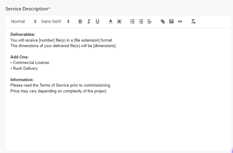 - Description: Explain what you’re offering and what clients can expect. Keep in mind, there is a default description for all services to give you a template to build on.